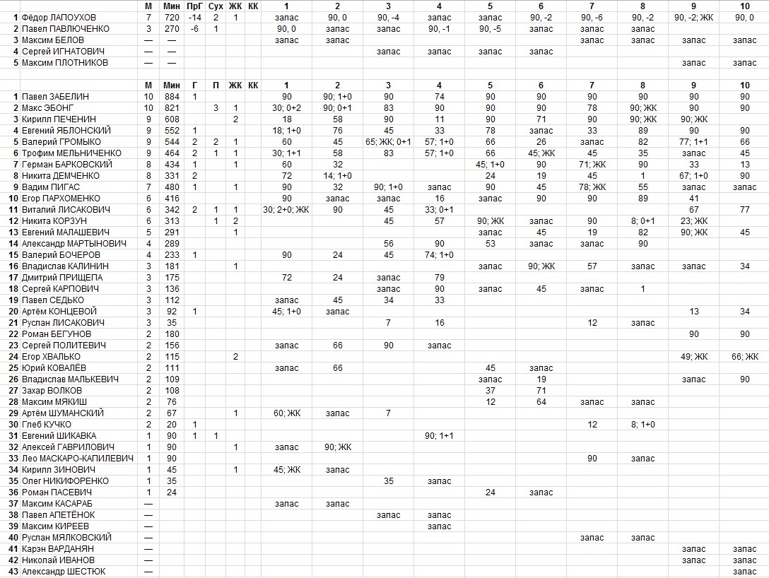 • В заявках на матчи Карлос Алос использовал 48 футболистов, однако на поле выходили только 38 из них — 2 вратаря и 36 полевых игроков. Лишь двое сыграли во всех 10 играх — Павел Забелин и Макс Эбонг. У Кирилла Печенина, Евгения Яблонского, Валерия Громыко, Трофима Мельниченко — по 9 игр, у Германа Барковского, Никиты Демченко — по 8, у Вадима Пигаса — 7.